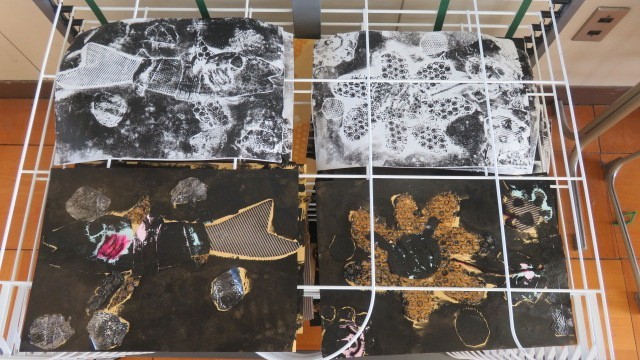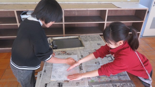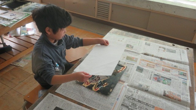 1組の図工も、紙版画の印刷をしました。ローラーにくっついてはがれてしまったパーツをもう一度元の位置に置き、丁寧に刷り上げました。