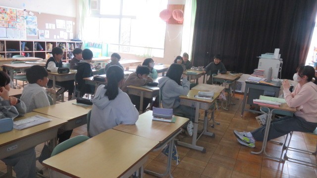 4時間目に、今年度の登下校の様子を振り返ったり、4月に入学してくる新1年生の班を確認したりするために、通学団会を開きました。これからは、5年生以下の人が班長・副班長の仕事を担い、6年生は見守る立場になります。これまで班をまとめてくれた6年生、お疲れさまでした。