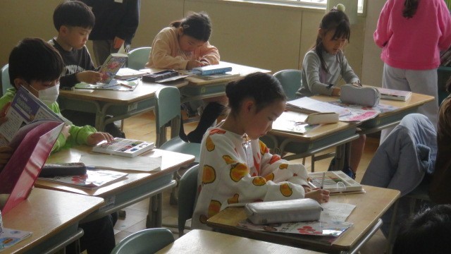 昨日行った「卒業を祝う会」で、自分ががんばったことや他の学年の演技を見て思ったことなどを、絵と文で振り返りました。