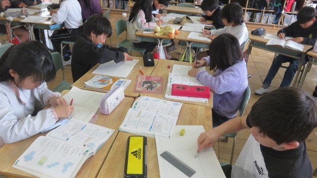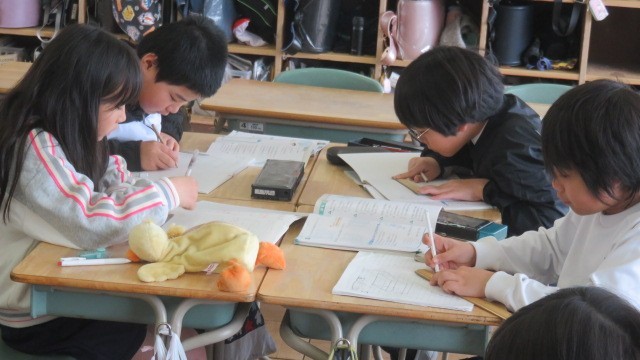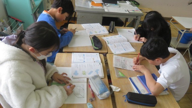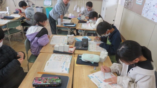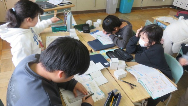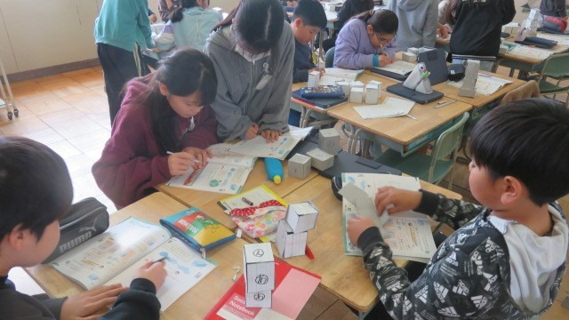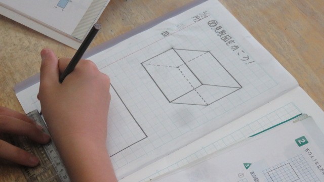 算数の時間は、直方体や立方体の、展開図や見取り図をかく学習をしています。方眼ノートのマス目を慎重に数えながら、作図をしました。
