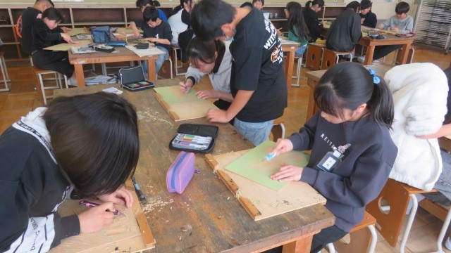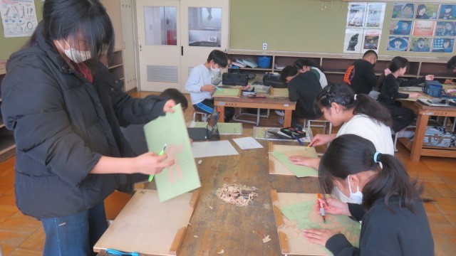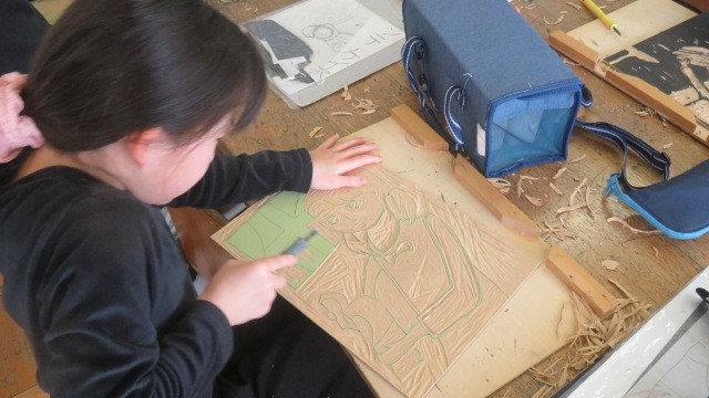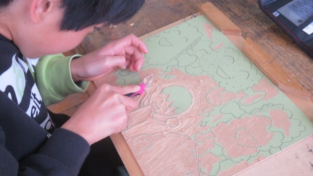 図工は、木版画の「彫り」を行いました。彫刻刀を扱うのは2年目です。コツを思い出し、滑らかに彫り進めていました。