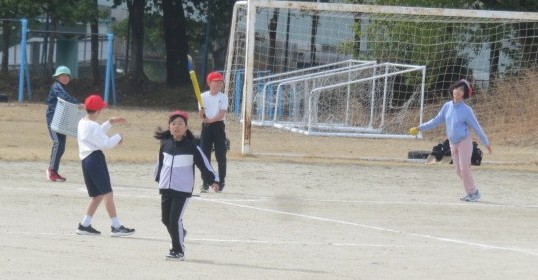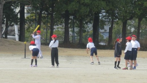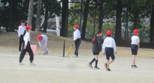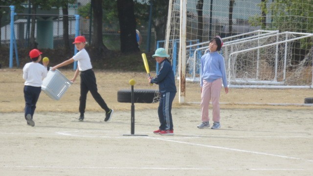 体育は、カラーコーンをハードルに見立てて跳び越す練習をしたり、Tボールの「打つ・守る」の練習をしたりしました。