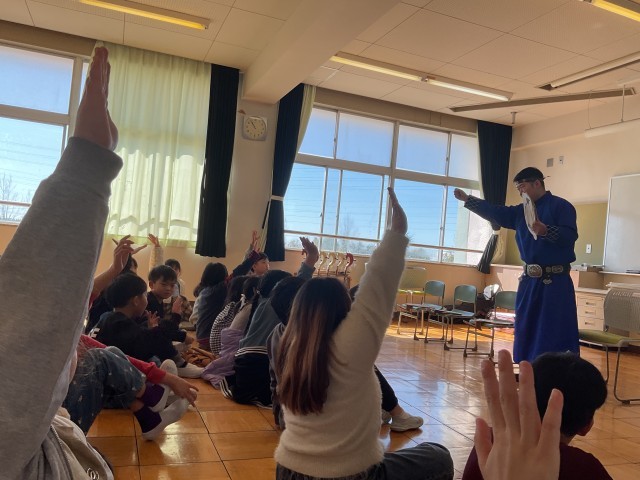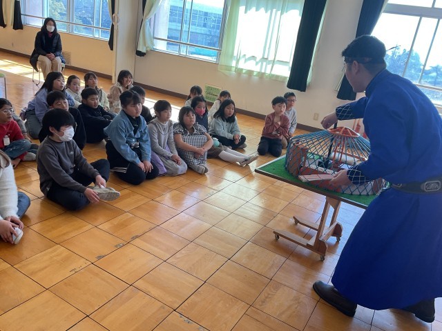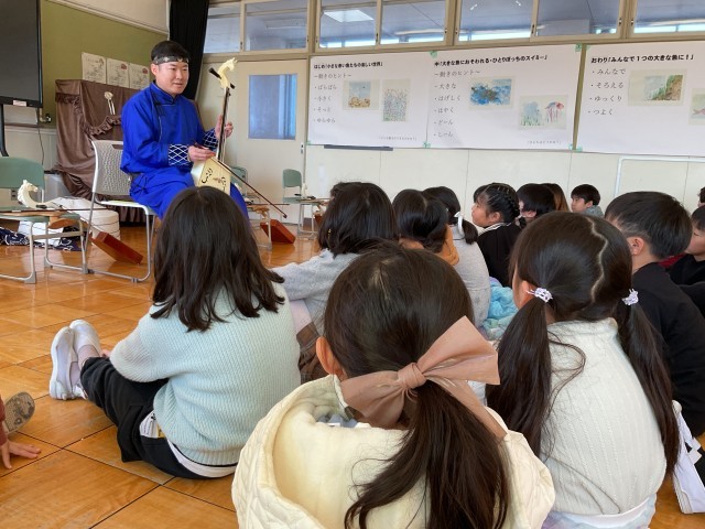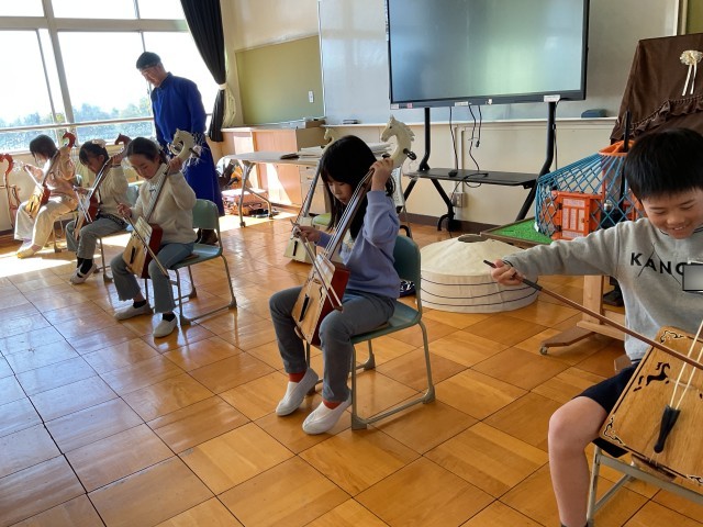国語「スーホの白い馬」の作品にも出てくる馬頭琴の演奏会がありました。今のモンゴルと、昔のモンゴルの違いや、暮らしなどを教えてもらいました。馬頭琴の演奏も一人ずつ全員させていただきました。きれいな音がなりましたが、演奏するにはたくさんの練習が必要だということが分かりました。動物の声や草原の様子を表す曲をいくつかを演奏していただきました。音色の心地よい響きに癒されました。