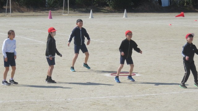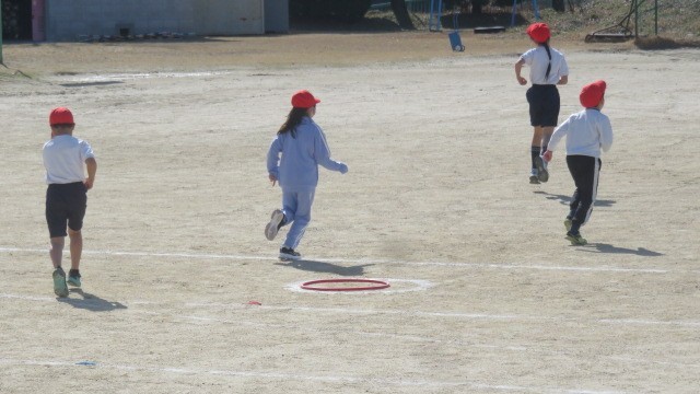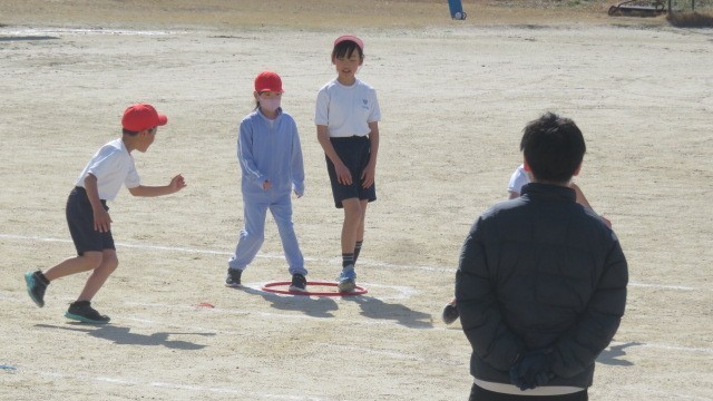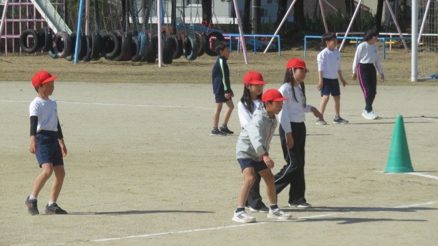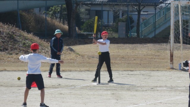 Tスタンドを使った、ミニベースボールのゲームを行いました。「打って走る」、「とってアウトにする」という野球の入門です。