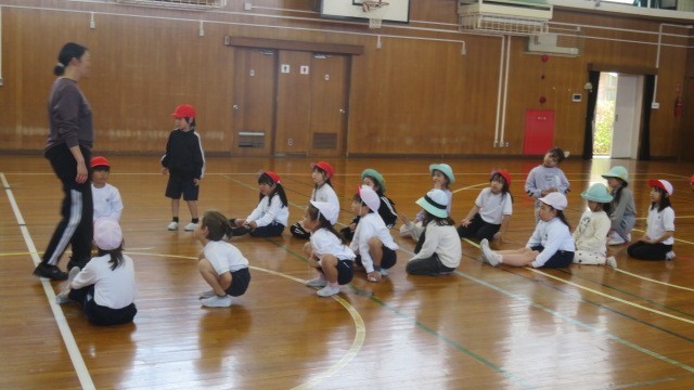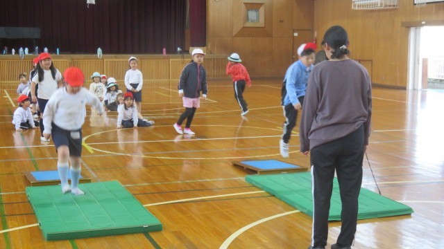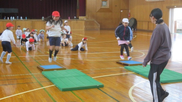 跳び箱を跳ぶときの、両足踏み切りの練習をしました。ロイター板の上で両足でジャンプすることが意外に難しいようで、2度両足でジャンプりたり、片足踏み切りになったりと苦戦していました。