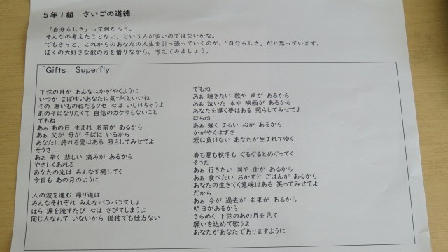 5年生最後の道徳の時間。自分らしさって、なかなか自分ではわかりません。そこで、お互いに相手の素敵なところを付箋に書いて、Giftsとして贈ります。1枚目のGiftsは、先生からの付箋です。この後、シートをGiftsでいっぱいにしました。