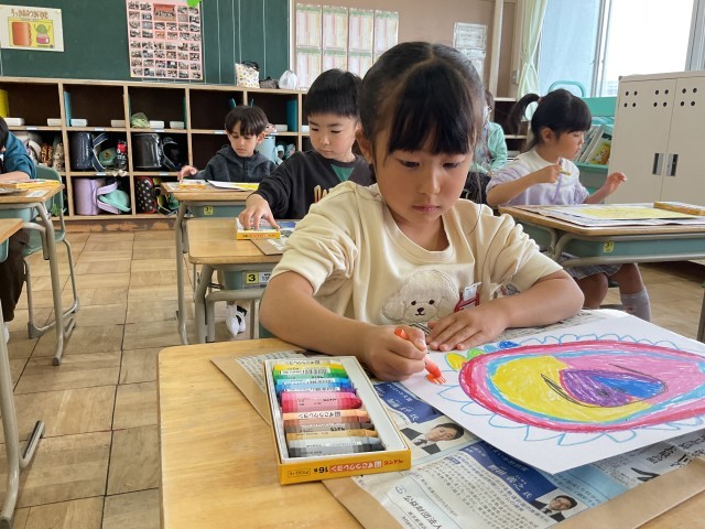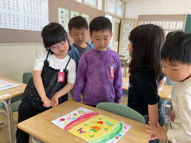 「あったらいいな」と思うおひさまを思い浮かべて描きました。また、友達の作品の良いところもたくさん見つけることができました。