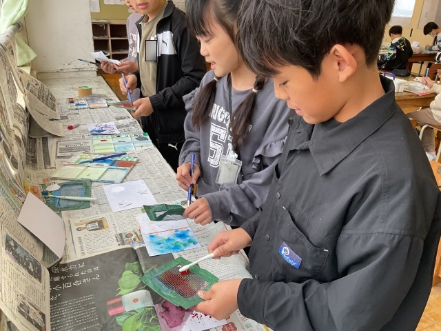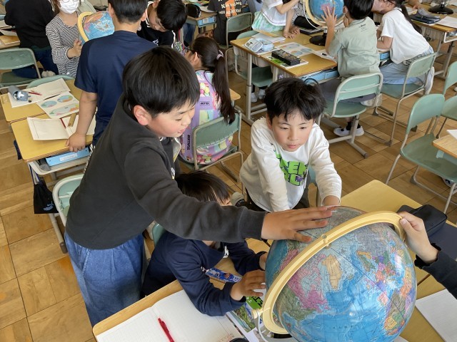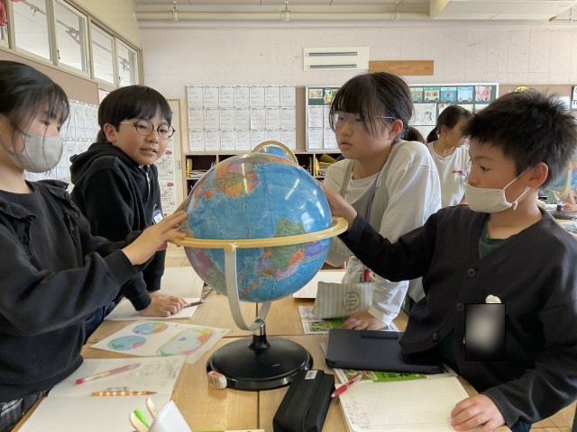 図工では、絵の具を使って様々な気持ちを表しました。スパッタリングやぼかしなどの技法を使って工夫していました。先日の社会では、地球儀を回して世界の国々を見つけました。地球儀にみんな釘付けで、国の大きさや位置を学習していました。