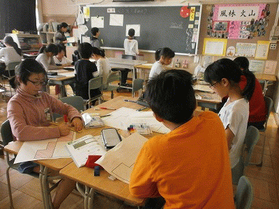 今日の算数は、『わくわく算数学習』の階段状の図形の面積を求める問題に挑戦しました。めあては「くふうして求めよう」です。各グループで相談しながら、いろいろ工夫して様々な方法で求めていました。
