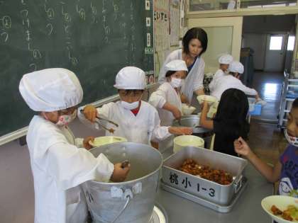 給食当番頑張っています。1年生だけでできることが増えました。仕事を覚えて、前よりも手際よくできるようになりました。食缶を空にしようと頑張って盛り付けています。