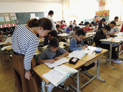 今日の算数は、今までのまとめの練習問題アスレチックに挑戦です。忘れてしまっていて苦労している子もいましたが、みんな頑張っていました。わからない問題は先生に教えてもらったり、できた人は先生に見てもらったりしながら、みんな一生懸命取り組んでいました。