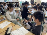 今日の社会科は、国土のいろいろな地形の勉強で、めあては「日本の地形をノートにかこう」です。教科書の写真や資料を見ながら、日本の地形についていろいろ調べていました。また、世界の主な川の長さとかたむきをかいたグラフを見ながら、日本と外国の主な川のちがいについてグループで話し合っていました。