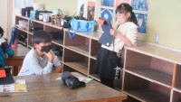 教室で、どんな光と影をつくろうか考えを出し合った後、多目的室に移動しました。