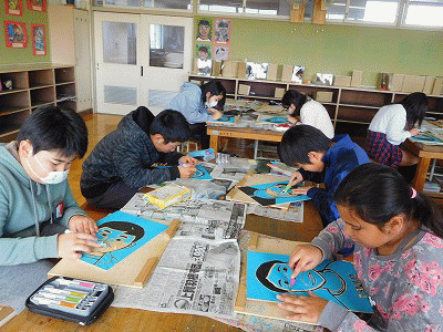 今日の図工は、木版画で自画像を彫っていました。デジタル教科書の動画を見たり、先生にみてもらったりしながら、みんな頑張っていました。