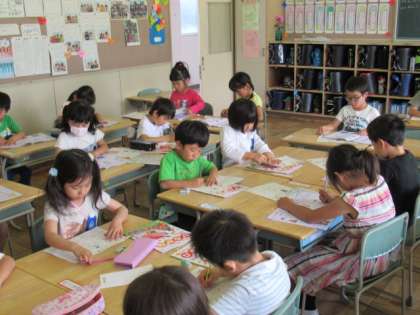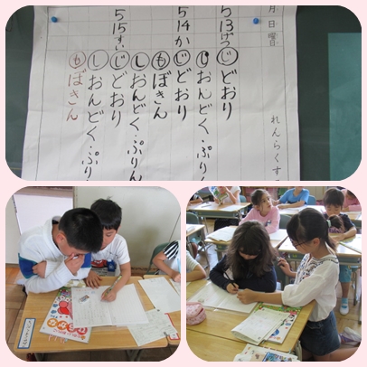 1年生が明日の連絡を書く時に6年生がお手伝いをしてくれます。