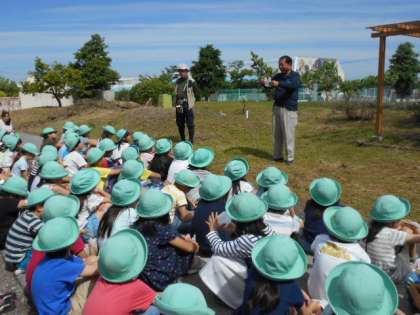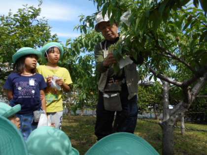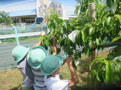 晴天にもめぐまれ、桃の袋かけを体験することができました。「ももに服を着せるため」という話を聞いて、みんなやさしく袋をかけていました。これからさらに大きくなっていくのが楽しみですね。