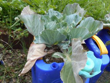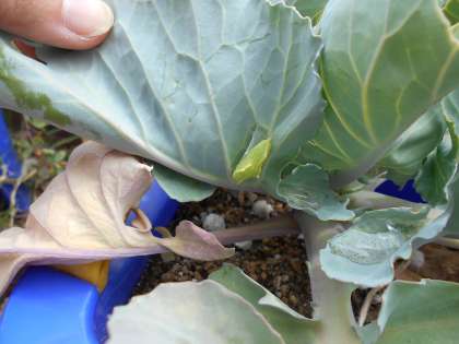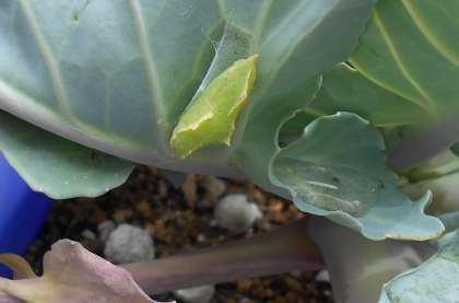 キャベツを食べていたあおむしたち(チョウチョの幼虫)が、サナギになっていました!サナギの期間が終わると・・・飛び立つ準備かな。