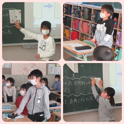 正方形について学習しました。紙を使って角の大きさや辺の長さをはかって特ちょうをまとめました。