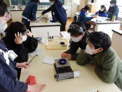 名前が分からない水溶液を蒸発皿に少量ずつとり、熱して水を蒸発させ、においや蒸発皿に残ったものを観察しました。