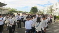 修学旅行のしおりを見ながら、日程や班別行動の注意などを確認しています。