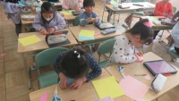 先生が読んだお話を聞いて、感想文を書きました。友達と感想文を読み合って、どんなことを書くとよいのかを学びました。