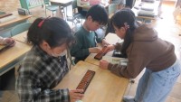 理科は、「ゴム・針金・ビニルテープ・毛糸・紙テープ」の中で、一番音がよく伝わるのはどれかを予想し、実験しました。予想では、針金が一番手が上がりました。