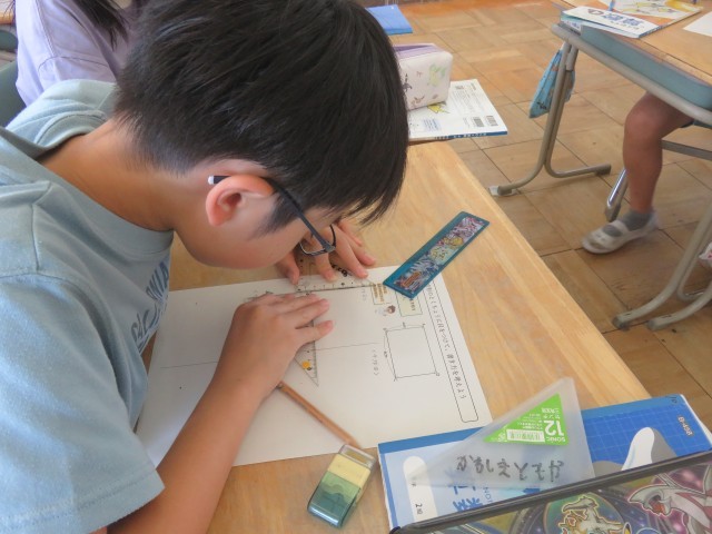 一組の三角定規を使って、垂直な直線や平行な直線のかき方を学習しました。それを使って、今日は、長方形をかく問題に取り組みました。