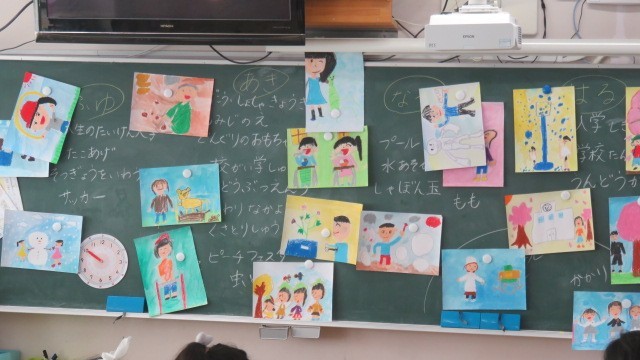春夏秋冬に分けて、どんなことがあったかを出し合い、その場面の絵を描きました。入学...