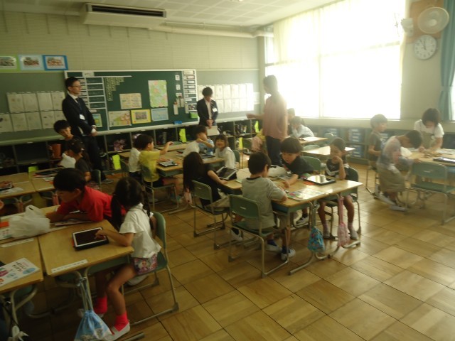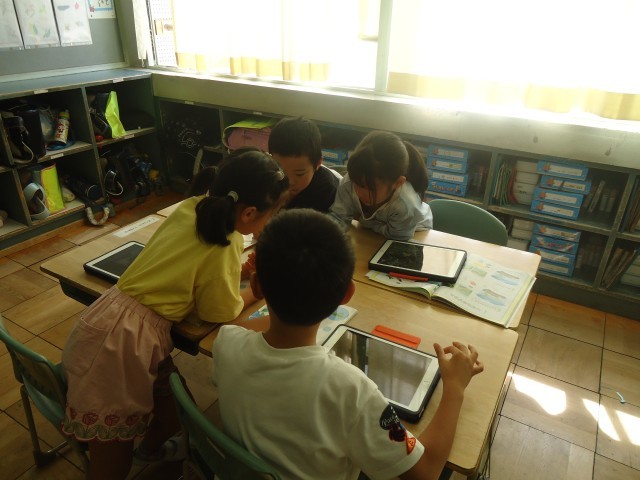タブレットで撮影した写真や採取したものを見せ合いながら、グループで聴き合いました。