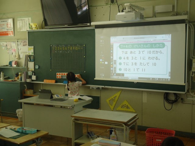 1年生の算数は、繰り上がりのある足し算を行っていました。