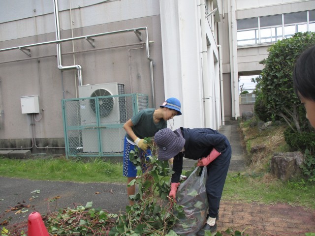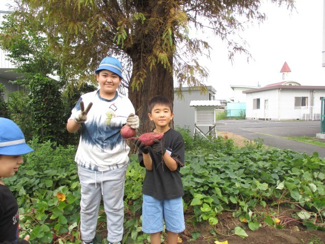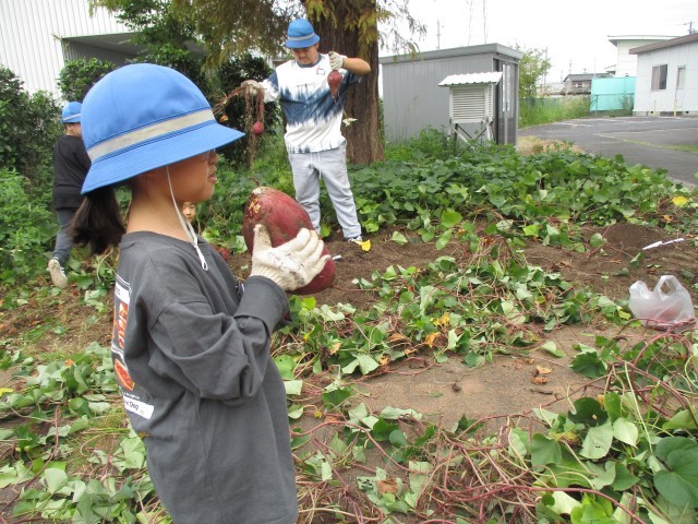 5・6組さんで大切に育ててきたサツマイモを収穫しました。土の中から掘り出したサツマイモの大きさに驚きました。長い長いツルにも驚きました。