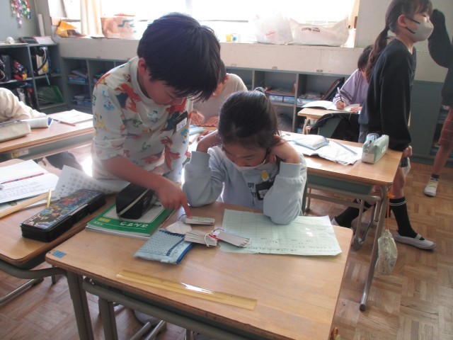 算数では、かけ算を特訓しています。今日は7のだんがすらすら言えるように練習をがんばりました。友達と一緒に7のだんを唱えたり、問題を出し合ったりと友達とつながり合いながら学んでいました。