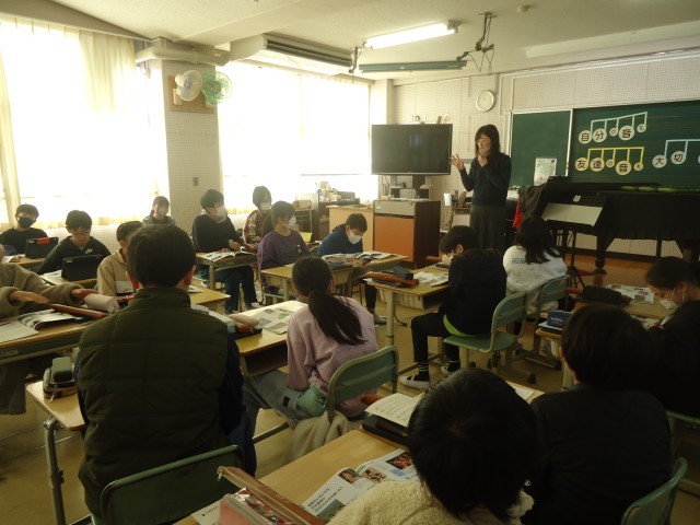 音楽室では、6年生が「ヨーデル」を聴いていました。