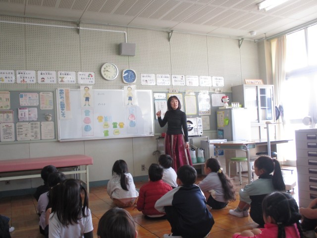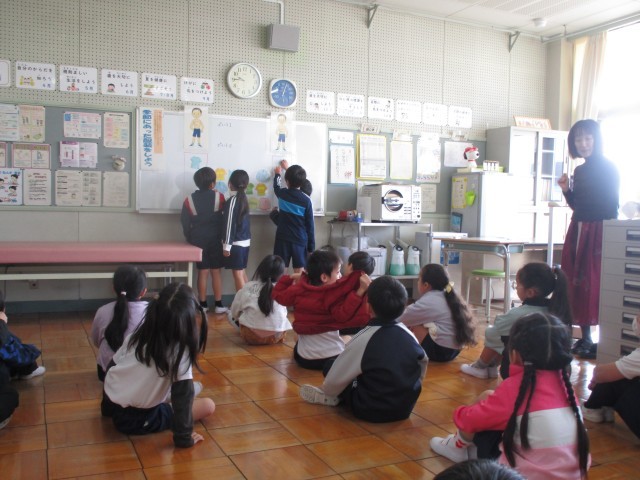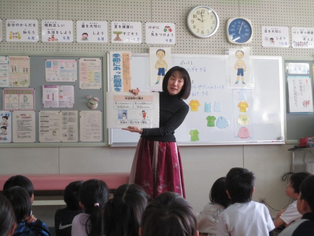 低学年の保健指導では、上手な冬のすごしかたについて考えました。まず、季節に合った着方を考えました。ペアの友だちと自分たちが考えた着方を紹介しました。冬は、下着を着ることや、様々な素材を組み合わせて着ることが大切であることを学びました。次に、上手な冬のすごしかたを教えてもらいました。季節に合った着方だけでなく、食事や運動に気をつけることも大切であると知りました。ペアの友だちとよく考え、先生のお話をよく聞くことができました。