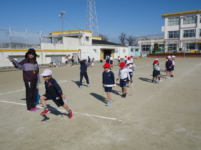 1年生の体育では、なわとびをする前に、様々なことをしています。
