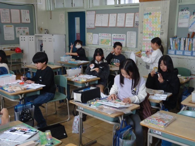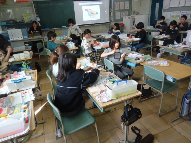 3年生の図工では、木材に色塗りをしていました。