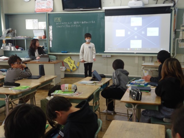 それぞれまとめたことを発表しています。仲間の発表をよく聴いていますね。