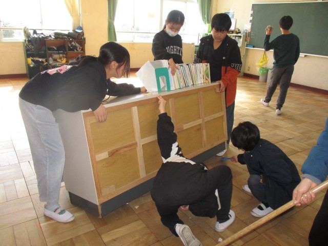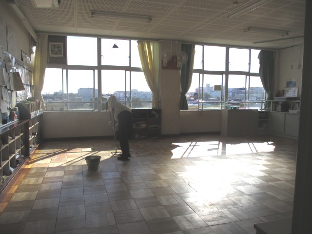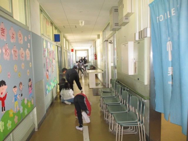 今日は、ワックスがけをするので、教室から荷物を廊下に運び出し、床を水拭きしました。どの学級もみんなで力を合わせて荷物を運び出したり、床をきれいにしたりしました。