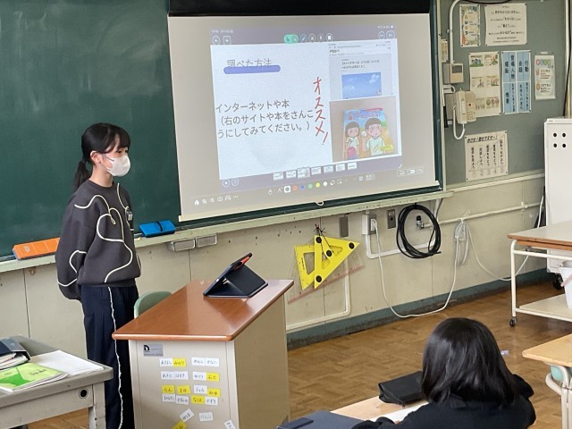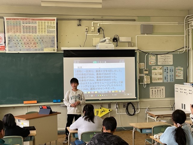 今日は、各々がテーマを決めて、調べたり実践を記録したりした、夢チャレ発表を行いました。