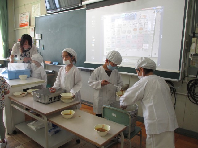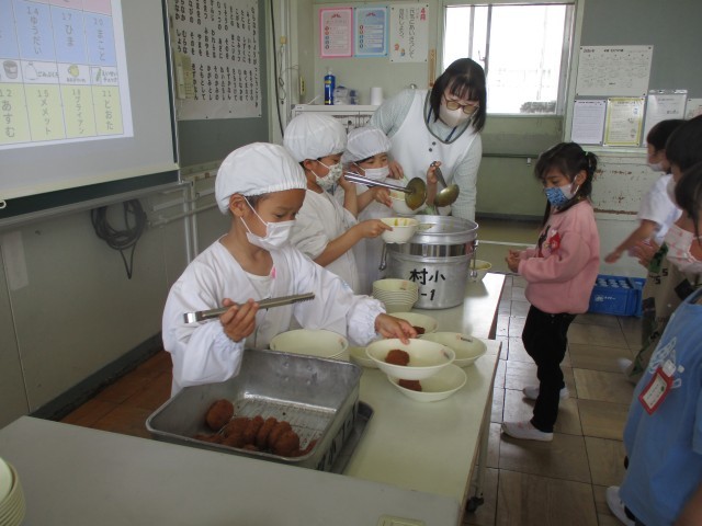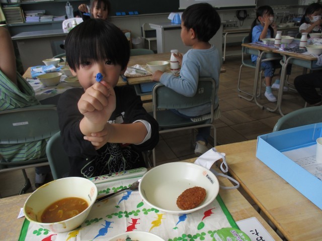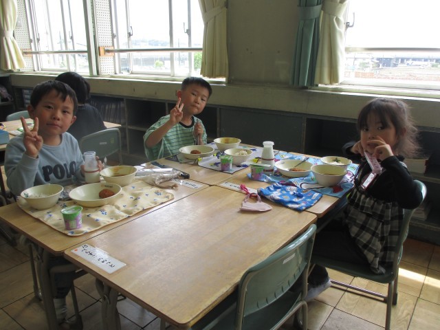 1年生が楽しみにしていた給食が始まりました。白衣を着たり、配膳をしたり、牛乳のフィルムを小さくしたりと、給食だけでもやることや覚えることがたくさんあります。子どもたちは初めてのことで戸惑いながらも、自分のやることをきちんとやり、無事に準備することができました。今日はカレーと揚げ物とゼリーが出ました。みんなにこにこ笑顔でおいしそうに給食を食べていました。