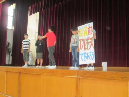 保健委員会が集会を行いました。この集会では、保健委員の仕事を知ってもらうことと正しい手洗いの仕方を覚え、健康な毎日を送ってもらうことを目的としました。これから暑くなります。暑さに負けない体を保ち、毎日元気に登校できるよう、全校の皆さんに啓発活動をしていきたいです。