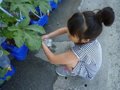 2年生は、毎朝、野菜の水やりと観察をしています。キュウリやなす、オクラは、ぐんぐん育って、早くも収穫した子もいます。ミニトマトは、実は一番早くなったのですが、なかなか赤くならず、収穫の日を今か今かと待っています。