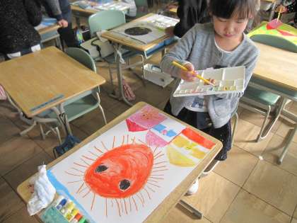 「おひさまにこにこ」というお話を聞いて、好きな場面を絵にしました。クレヨンと絵の具を使って、想像したことを楽しく描いていました。