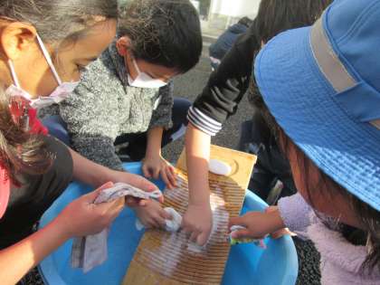 社会科の「昔のくらし」の学習で、洗たく板を使ってハンカチを手洗いしました。寒風の中、水の冷たさから「昔の人はとてもたいへんだったんだね。苦労がよくわかった。」と感想を発表していました。また、「よごれた部分を力を入れて洗ったから、洗濯機よりもきれいになった。」とうれしそうでした。