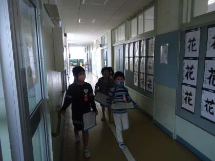 グループで学校探検をしました。気になる部屋に行き、どんなものがあるか観察しました。