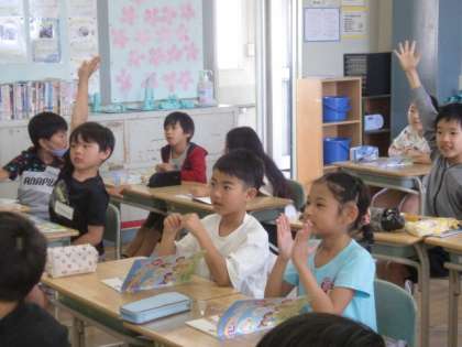 後半は、「Hello! My name is 〜.」の会話練習をみんなで楽しくしました。