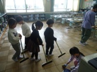 1年生のそうじの様子です。 床をほうきで掃いたり、ぞうきんで拭いたりしています...