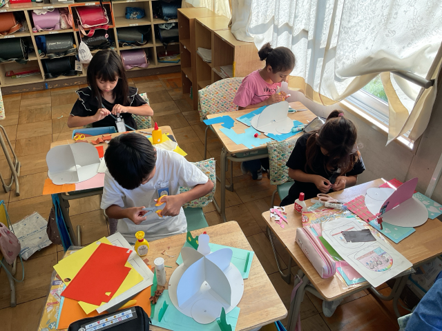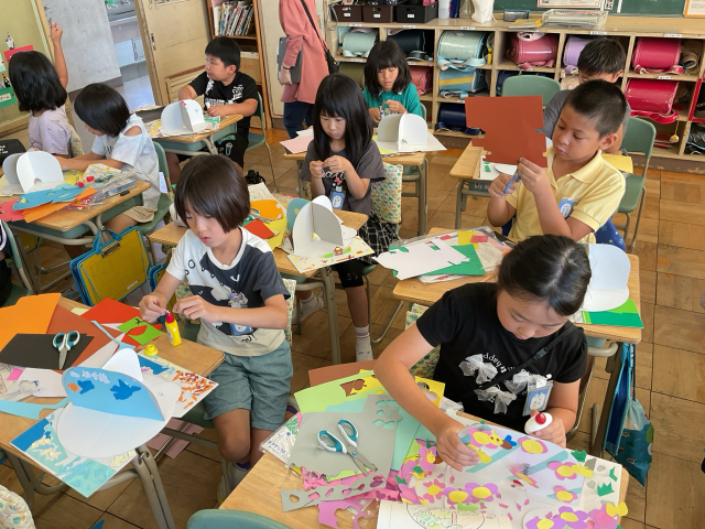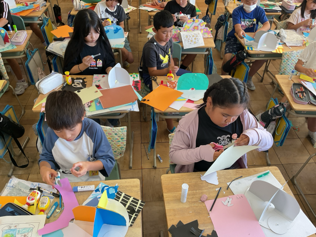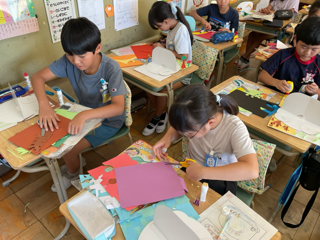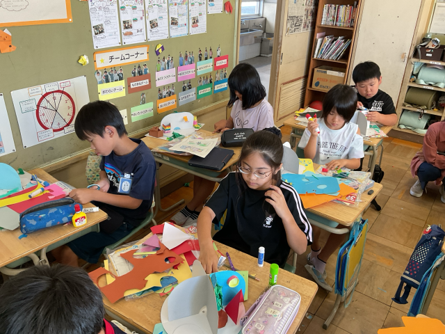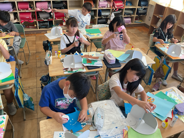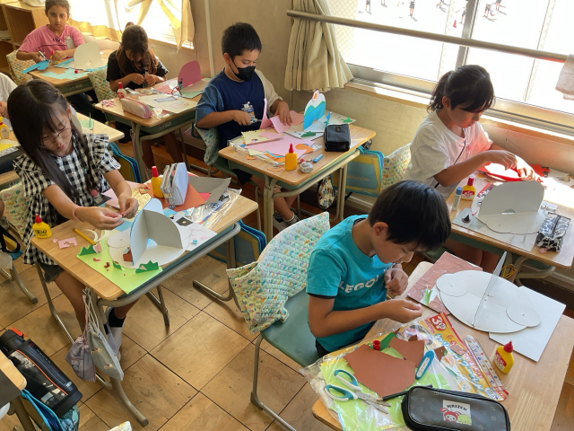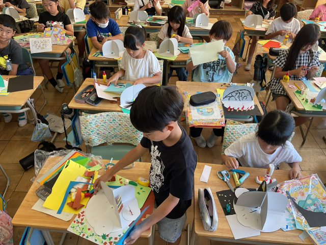 図工競技会が行われました。3年生は、「うごいて楽しい、わりピンワールド」という題材のもと、回る仕組みを利用して、さまざまな場面を作成しました。「天国と地獄」「春夏秋冬」「朝昼夜」など、自分が作りたい世界をイメージして、丁寧に作品を作り上げていました。