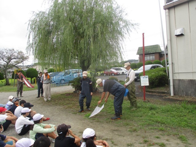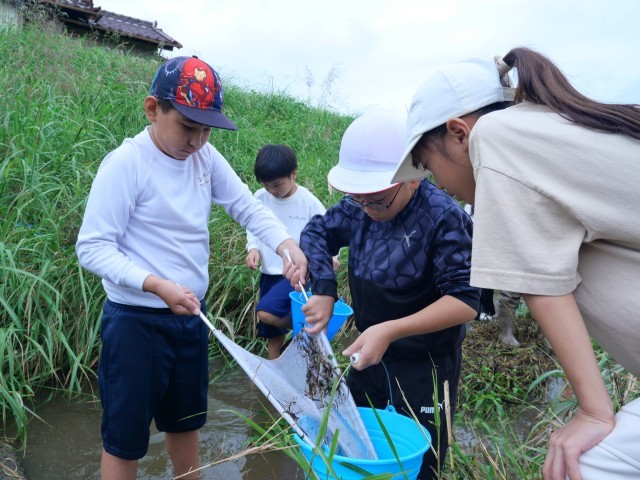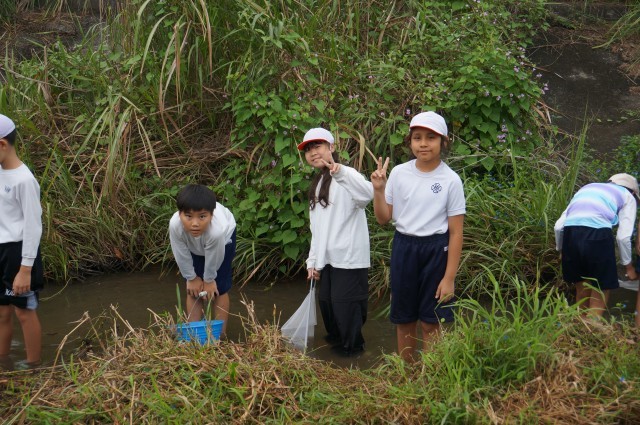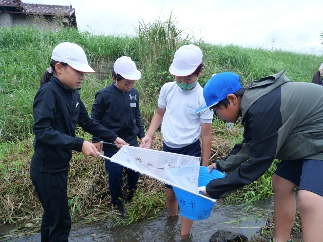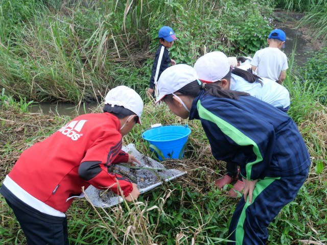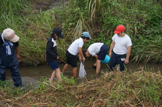 初めは、川に入り網を使って生き物をたくさん捕まえました。
