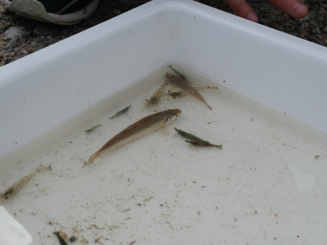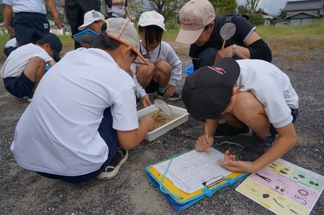 バケツに捕まえた生き物をバットに移し、種類を特定したり、数を数えたりします。